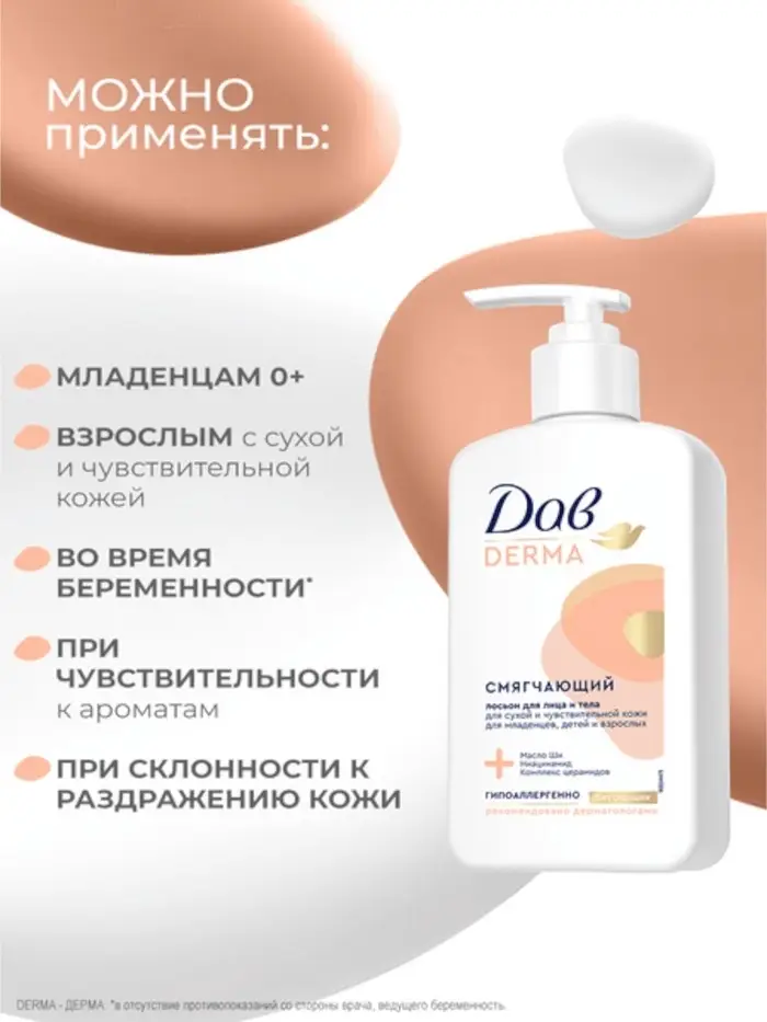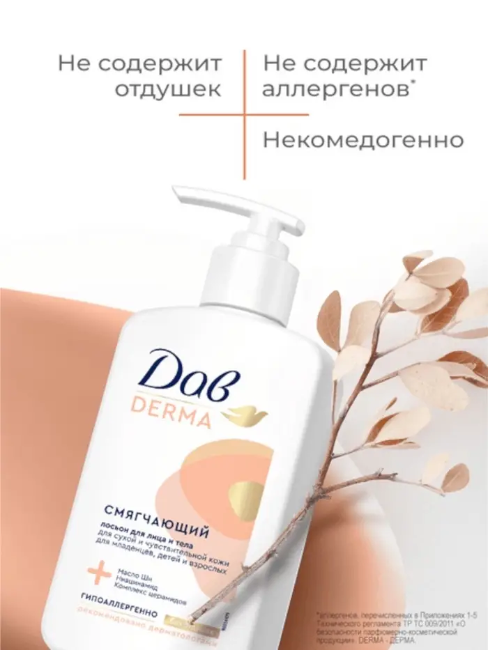 Смягчающий лосьон для лица и тела Дав Derma — это средство для ежедневного ухода за сухой и чувствительной кожей.