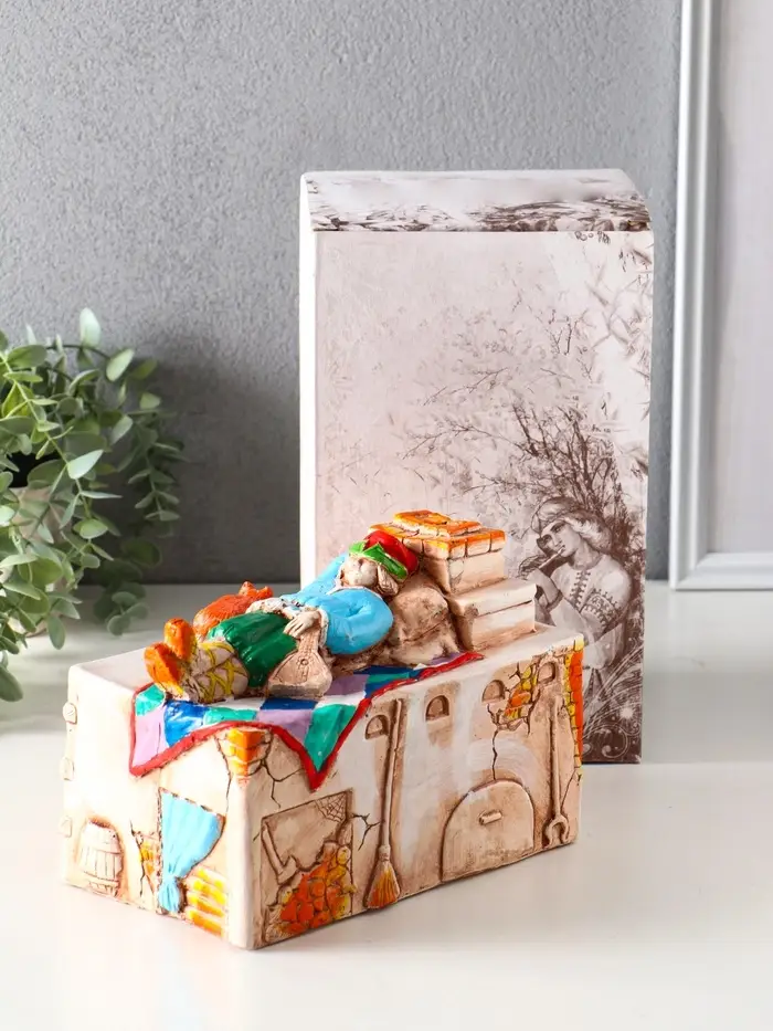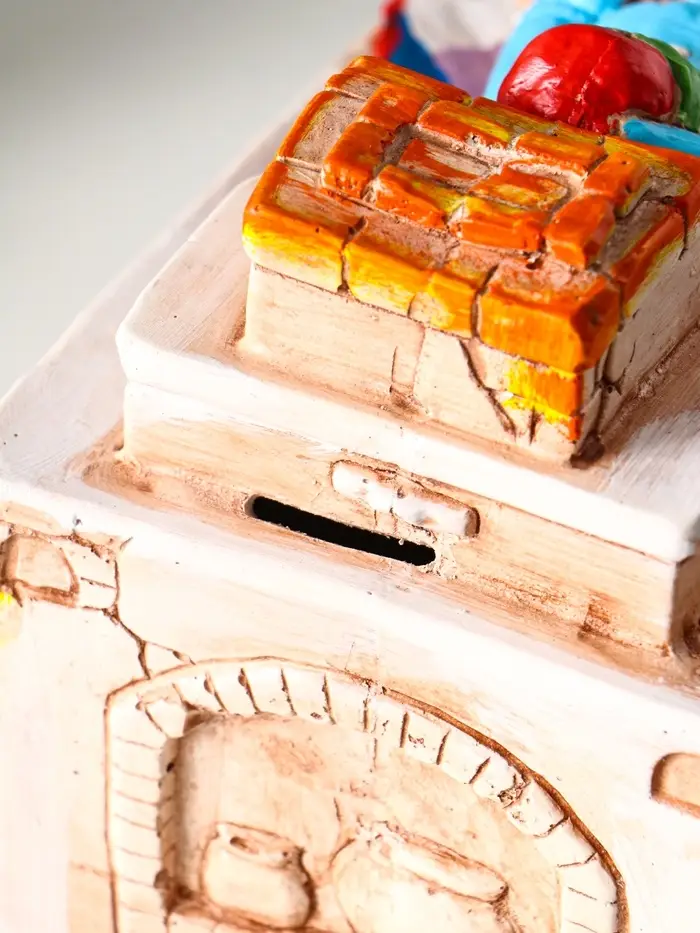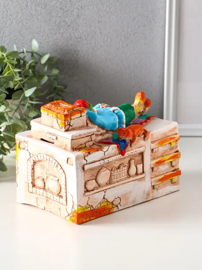 Эта гипсовая копилка в виде сказочной печки станет верным помощником в обучении ребёнка финансовой грамоте. Она превращает процесс накопления в маленькое волшебство, где каждая монетка — это дровца для топики, а купюры — драгоценный жар. Прочный гипсовый корпус делает её долговечным спутником детства.