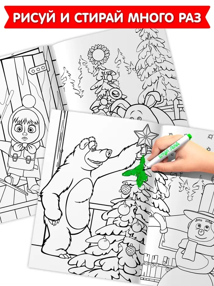 - 3 многоразовые раскраски с новогодними сюжетами и героями из мультфильма «Маша и Медведь».