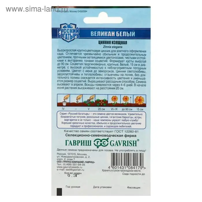 Семена цветов Цинния "Великан белый", ц/п, серия Русский богатырь, 0,3 г
