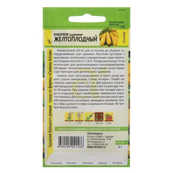 Раннеспелый (43-62 дня от посева до уборки) суперурожайный сорт цуккини. Растение кустовое, с красивыми, интенсивно окрашенными, ярко-желтыми плодами массой 0,7-1,8 кг. Плоды длиной до 10 см используют для цельноплодного консервирования. Обладают великолепными вкусовыми качествами. Сорт пригоден для длительного хранения. Семена сеют непосредственно в грунт, когда минует угроза возвратных заморозков. Для получения ранней продукции кабачки сеют на рассаду поздней весной, за две-три недели до высадки. Схема посадки 100х100 см, глубина заделки семян 3-5 см. При раннем посеве или посадке рассады в открытый грунт необходимо временное укрытие пленкой. Для получения наиболее высокого урожая рекомендуется регулярно проводить рыхление почвы и умеренные поливы. В период цветения-налива плодов рекомендуется провести подкормку комплексными минеральными удобрениями. Сбор урожая по мере созревания плодов. Не требует формировки.