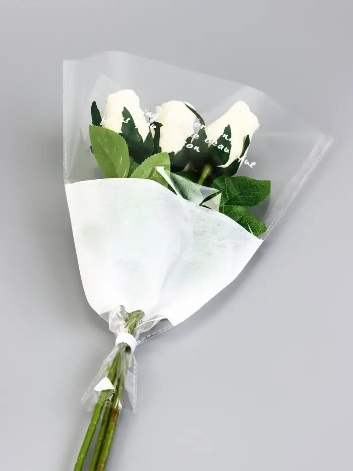 - Пакет изготовлен из качественного материала, который обеспечивает надёжность и долговечность. Нетканый материал обладает хорошей воздухопроницаемостью, что способствует сохранению свежести цветов на долгое время.