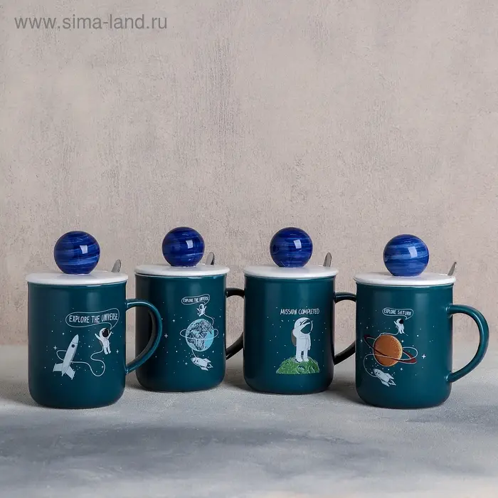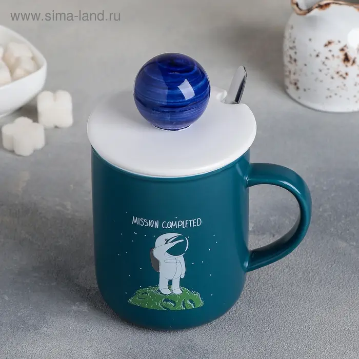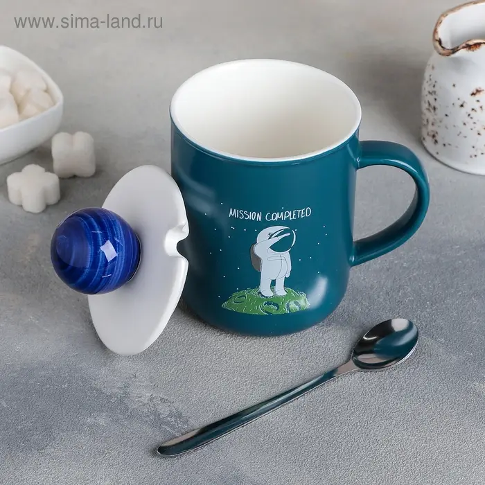 Кружка керамическая с крышкой и ложкой «Космонавт», 350 мл, рисунок МИКС