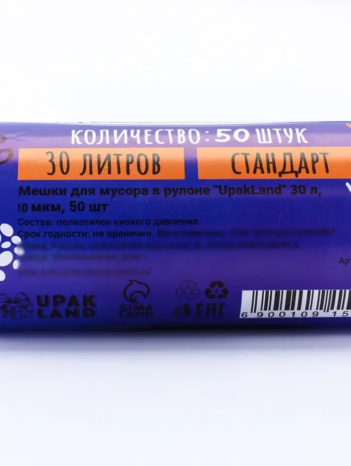Мешки для мусора в рулоне 30 л,черные, ПНД,толщина 10 мкм, 50 шт