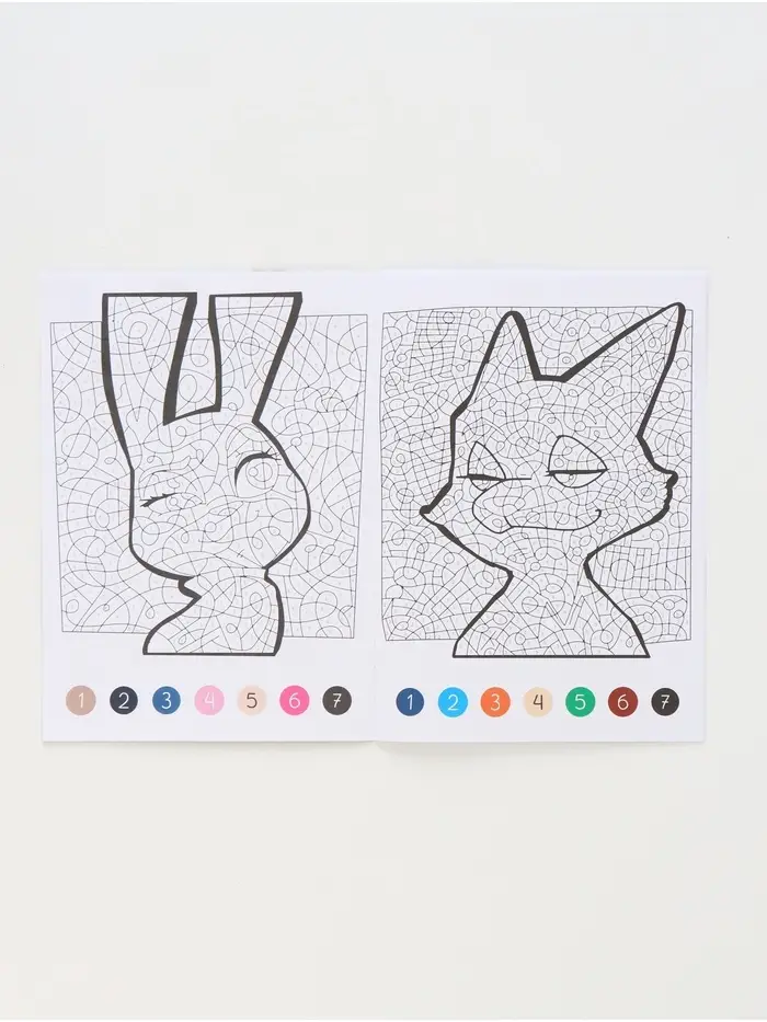 - 16 страниц с изображениями персонажей мультфильма «Зверополис», пронумерованными областями для раскрашивания.