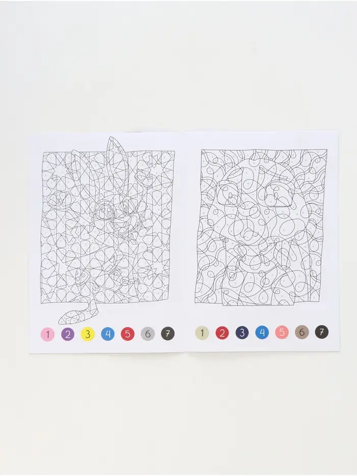 - На каждой странице представлена палитра с указанием соответствия номеров и оттенков, что помогает ребёнку ориентироваться в цветах.