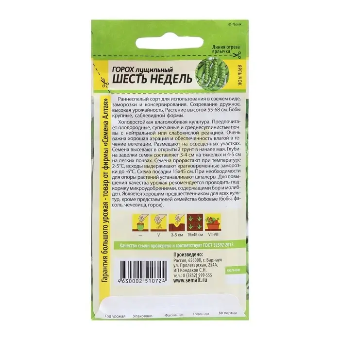 Семена Горох "Шесть недель", лущильный, скороспелый, ц/п, 10 г