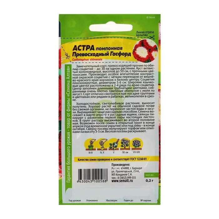 Семена цветов Астра "Превосходный Гасфорд" помпонная, О, ц/п, 0,2 г