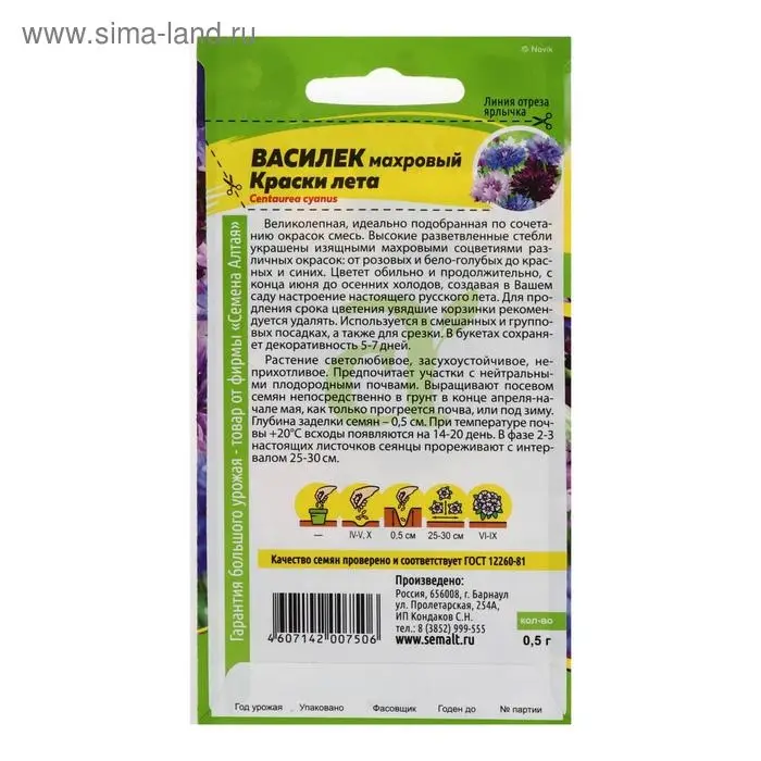 Великолепная, идеально подобранная по сочетанию окрасок смесь. Высокие разветвленные стебли украшены изящными махровыми соцветиями различных окрасок: от розовых и бело-голубых до красных и синих. Цветет обильно и продолжительно, с конца июня до осенних холодов, создавая в Вашем саду настроение настоящего русского лета. Для продления срока цветения увядшие корзинки рекомендуется удалять. Используется в смешанных и групповых посадках, а также для срезки. В букетах сохраняет декоративность 5-7 дней. Растение светолюбивое, засухоустойчивое, неприхотливое. Предпочитает участки с нейтральными плодородными почвами.