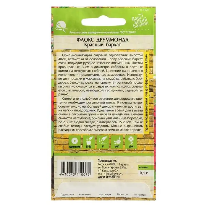 Обильноцветущий садовый однолетник высотой 40 см, ветвистый от основания. Сорту красный Бархат очень подходит русское название «пламенник». Цветки ярко-красные, до 3 см в диаметре, собраны в плотные щитки на верхушках стеблей. Цветение начинается в июне-июле и продолжается до заморозков. Флокс широко применяют для групповых посадок в массивах, на клумбах, рабатках, бордюрах, выращивают в балконных ящиках, он отлично смотрится в садовых композициях, реже используют для срезки. Свето- и теплолюбивое растение, для хорошего цветения необходим регулярный полив. К почвам нетребовательно, но наибольшей декоративности достигает на плодородной почве. На рассаду семена высевают с конца марта. Емкости наполняют обычной посевной землей, проливают розовым раствором марганцовокислого калия. Сверху насыпают прокаленный речной песок, который должен пропитаться влагой от грунта. Семена раскладывают в продавленные бороздки глубиной 3 мм, плотно вдавливают в грунт, не заделывая сверху. Посевы накрывают пленкой и помещают в притененное место. Оптимальная температура для прорастания семян +18-20°С. Всходы появляются через 10-15 дней. При появлении первого настоящего листа проводят пикировку. В открытый грунт рассаду высаживают в конце мая – начале июня, когда минует угроза возвратных заморозков. Посадочный интервал 20-25 см. Можно выращивать посевом семян в открытый грунт в самые ранние сроки.