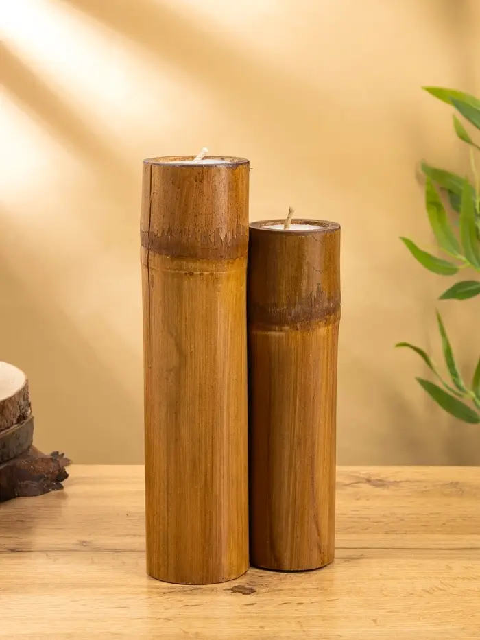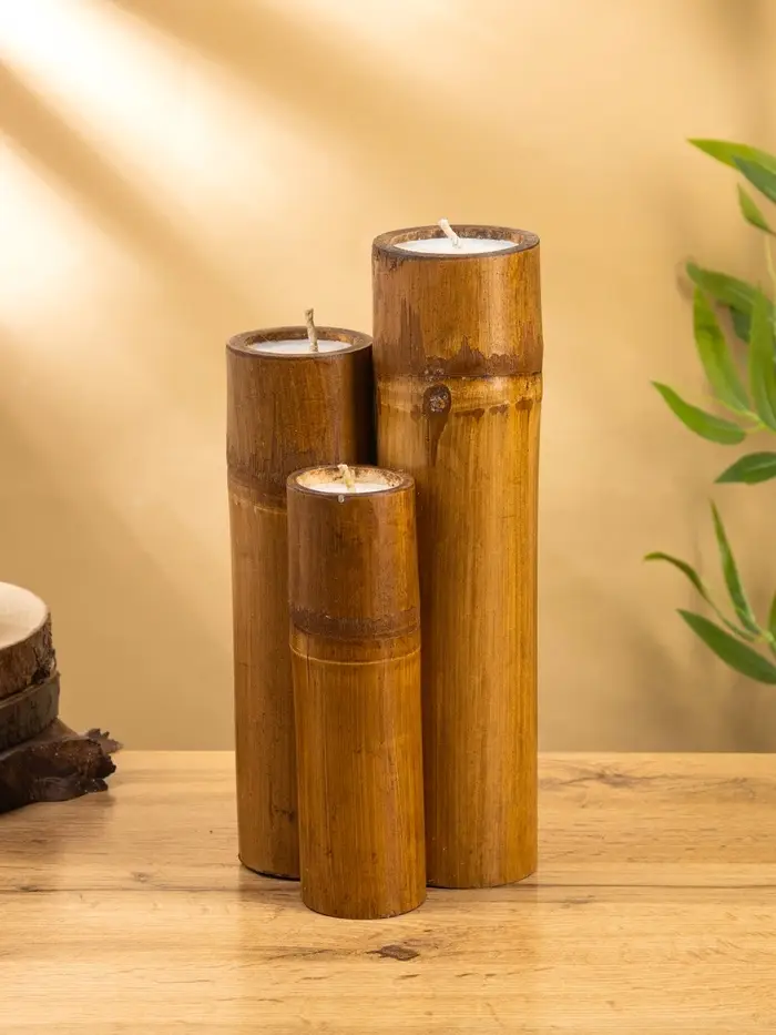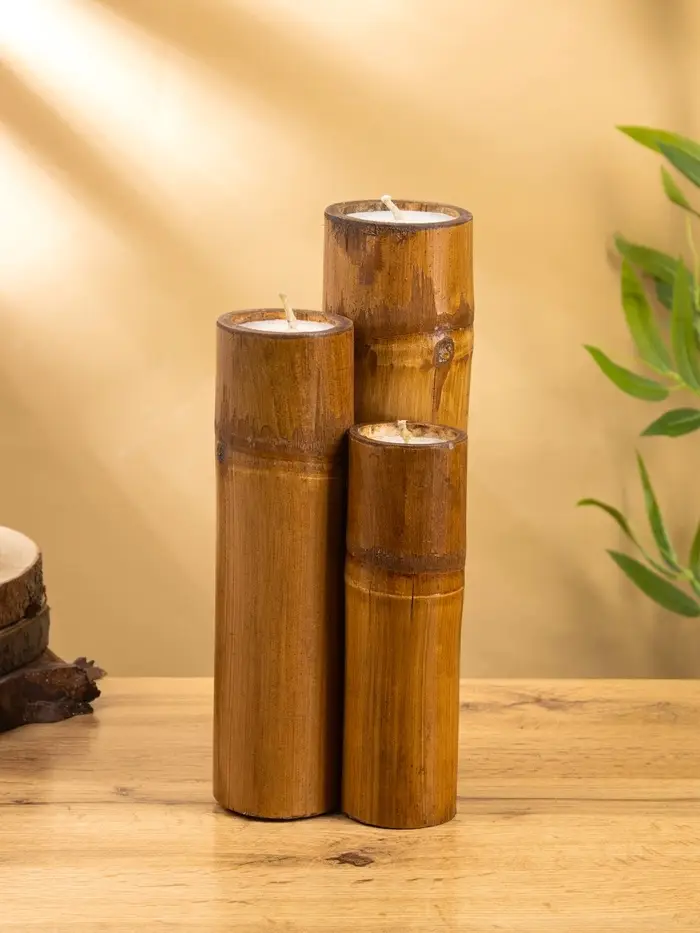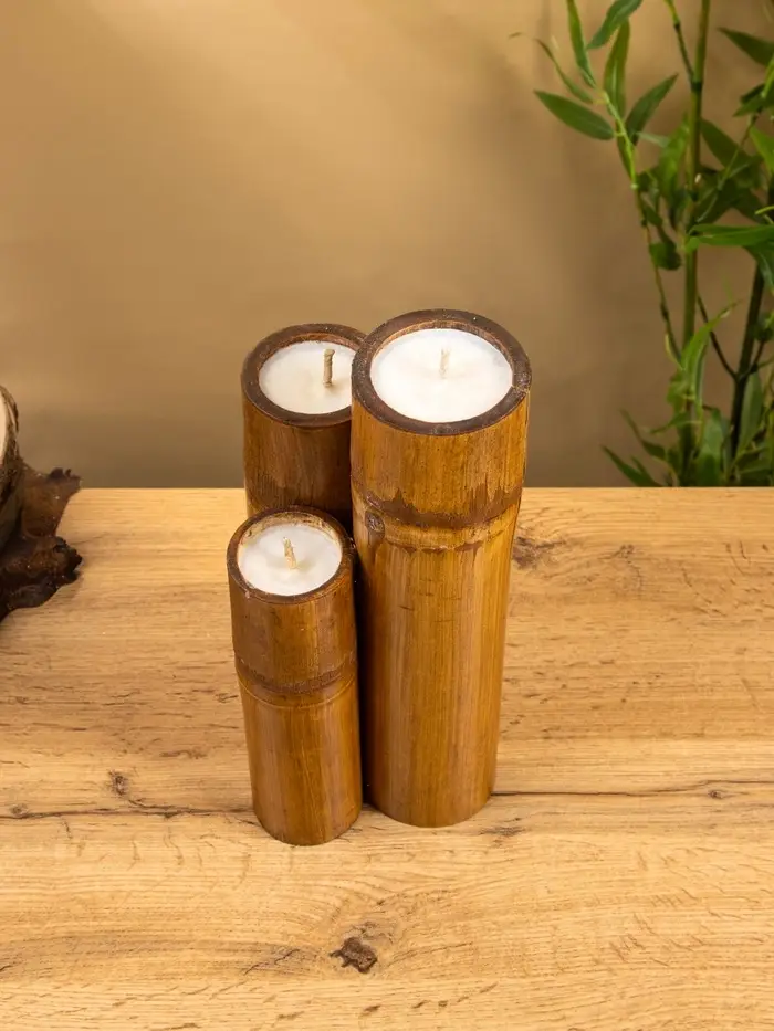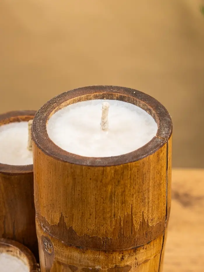 Свеча в бамбуке тройная, 14×15×30 см, 100 мл, бежевая