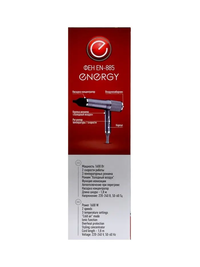 Фен Energy EN-885, 1600 Вт, 2 скорости, 3 температурных режима, ионизация, серый