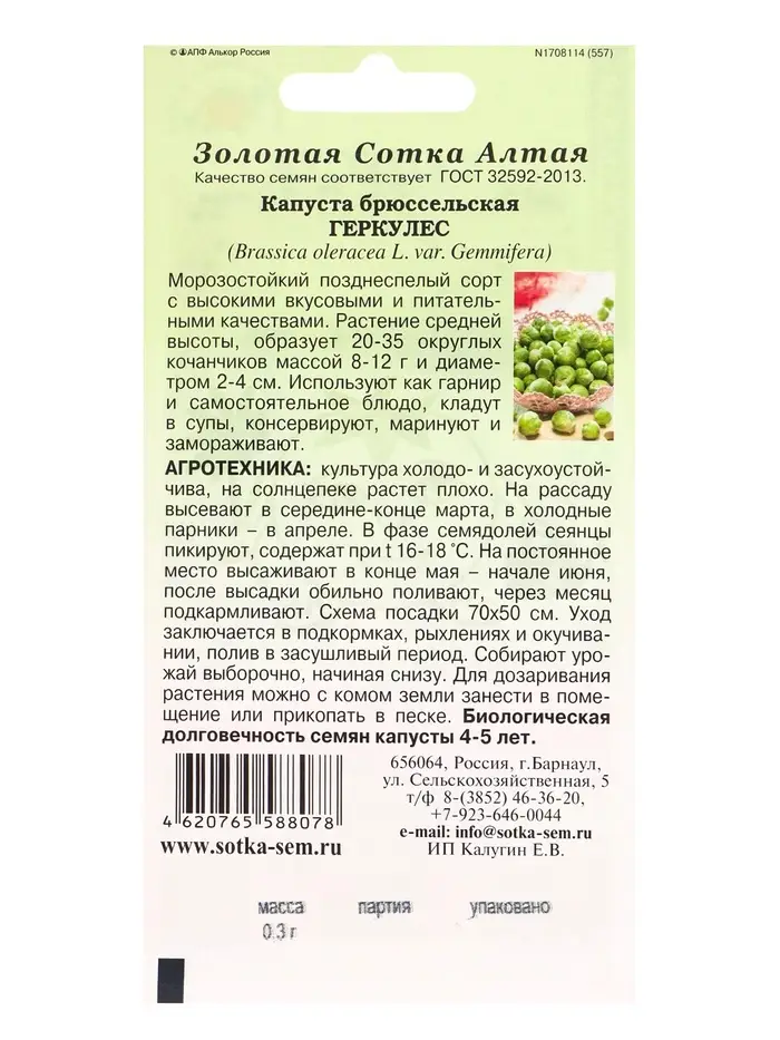 Семена Капуста брюссельская Геркулес /Сотка/ 0,3г/ позднесп. морозостойк. 8-12г/*1200