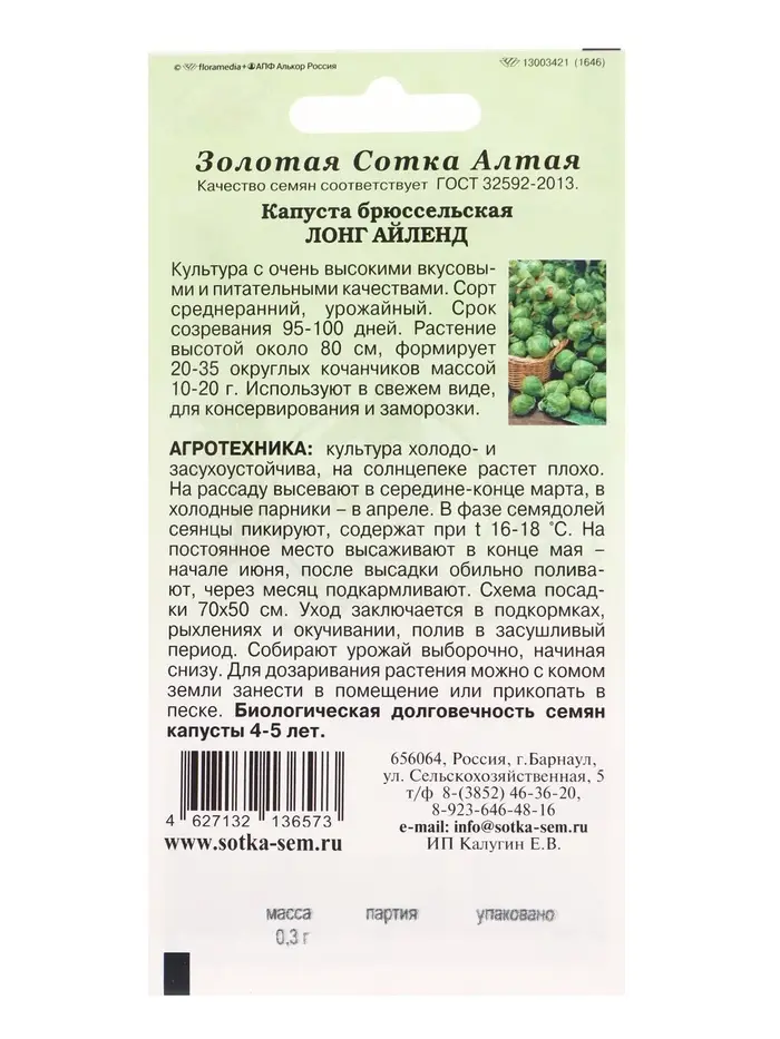 Семена Капуста брюссельская Лонг Айленд /Сотка/ 0,3г/ среднеран. 10-20г/*1200