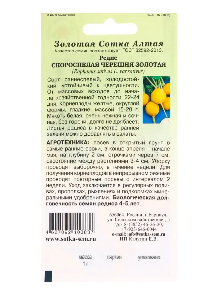 Семена Редис Скороспелая Черешня Золотая /Сотка/ 1 г/*800