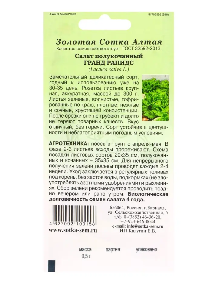 Семена Салат Гранд Рапидс /Сотка/ 0,5г/ листов. зеленый до 300г/*1500