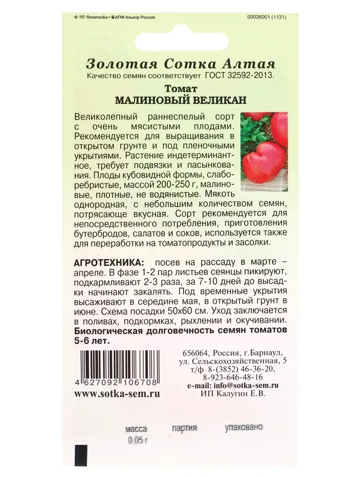 Семена Томат Малиновый великан /Сотка/ 0,05 г/*1500
