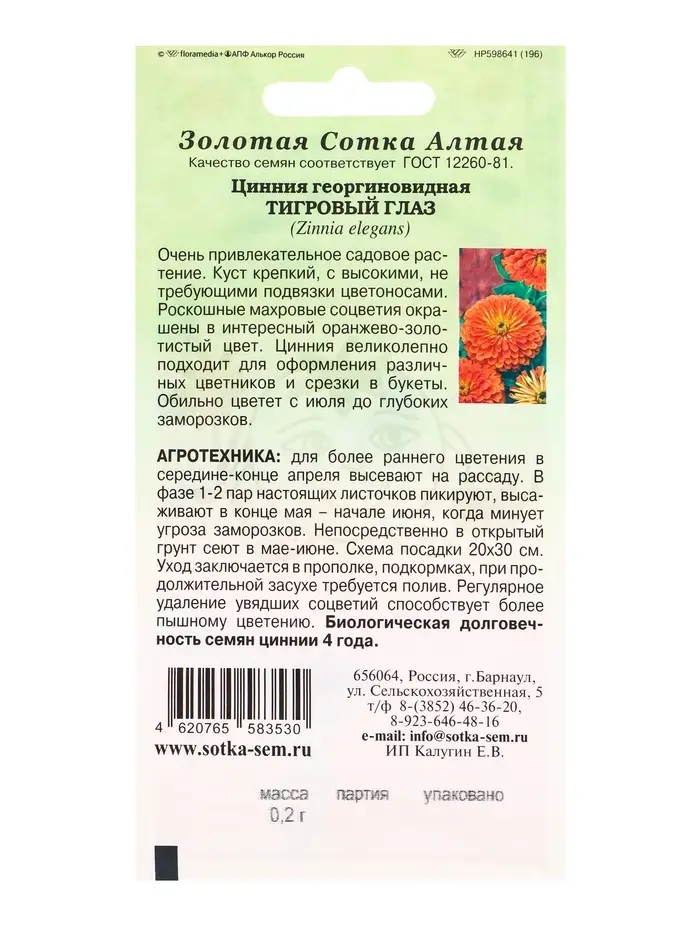Семена Цинния Тигровый глаз /Сотка/ 0,2г/ оранж. h-80см, d-15см/*1000