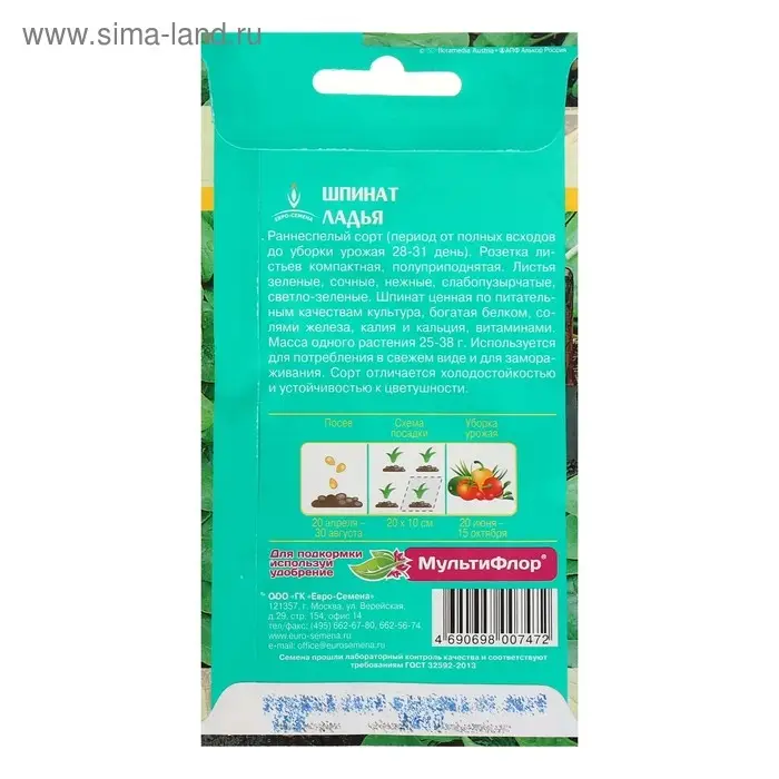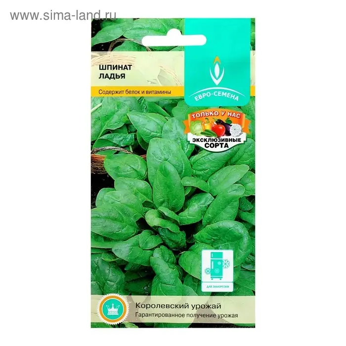 Раннеспелый сорт (период от полных всходов до уборки урожая 28-31 день). Розетка листьев компактная, полуприподнятая. Листья зеленые, сочные, нежные, слабопузырчатые, светло-зеленые. Шпинат ценная по питательным качествам культура, богатая белком, солями железа, калия и кальция, витаминами. Масса одного растения 25-38 г. Используется для потребления в свежем виде и для замораживания. Сорт отличается холодостойкостью и устойчивостью к цветушности.