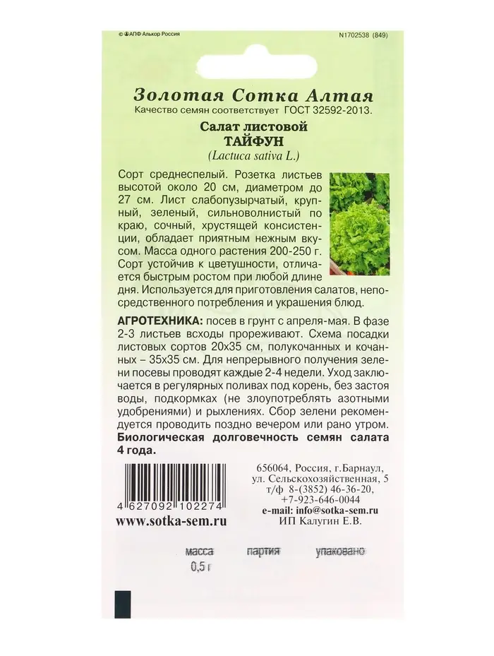 Семена Салат Тайфун /Сотка/ 0,5г/ среднесп. листов. зелен. h-20см d-27см/*1500