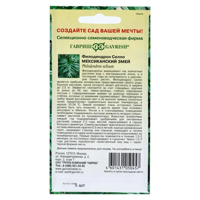 Семена комнатных цветов Филодендрон Селло "Мексиканский змей", ц/п, 5 шт.