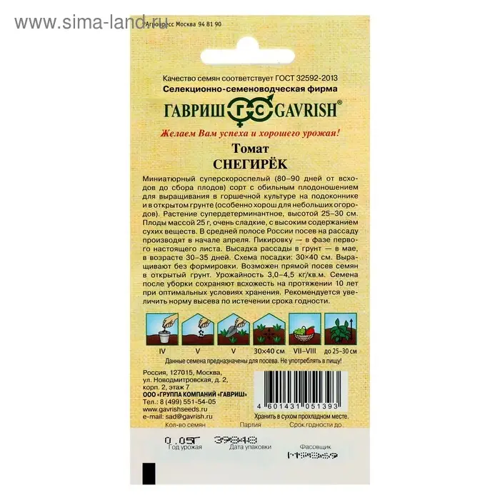 Семена Томат "Снегирек", суперскороспелый, 0,05 г