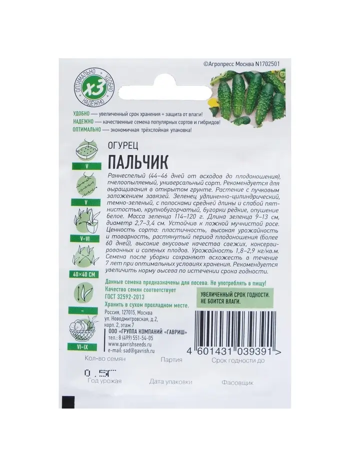 Семена Огурец "Пальчик", раннеспелый, пчелоопыляемый, 0,3 г серия ХИТ х3
