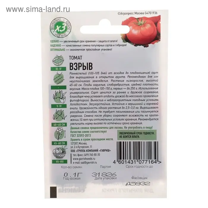 Раннеспелый (100-105 дней от всходов до плодоношения) сорт для выращивания в открытом грунте. Рекомендован для зон неустойчивого земледелия. Посев на рассаду в конце марта – начале апреля. Пикировка в фазе первого настоящего листа. Высадка в грунт в конце мая-начале июня. Растение низкорослое, высотой 45-60 см. Плоды округлые, слаборебристые, средней плотности. вкусные. Масса плодов 100-150 г, первых – до 250 г. Ценится за раннее и дружное созревание, благодаря чему успевает отдать урожай до массового проявления фитофтороза. Не требует пасынкования или пасынкуется умеренно. Вынослив к неблагоприятным погодным условиям. Холодостоек. Засухоусточив. Устойчив к вершинной и корневым гнилям. Использование универсальное. Урожайность одного растения до 2,5-3 кг.