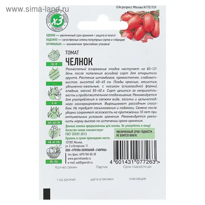 Раннеспелый (созревание плодов наступает на 82-121 день после появления всходов) сорт для открытого грунта. Растение штамбовое, прямостоячее, слабоветвистое, высотой 40-45 см. Плоды красные, мясистые, удлиненно-овальные, с носиком (сливовидной формы), гладкие, массой 50-60 г.