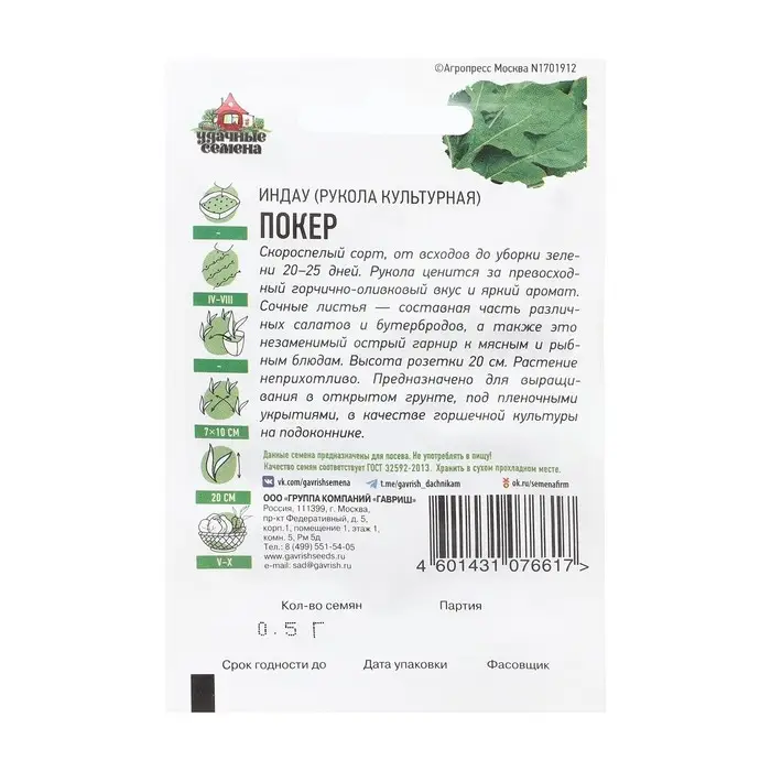 Семена Индау (Рукола ) культурная "Покер", ц/п, 0,5 г серия ХИТ х3