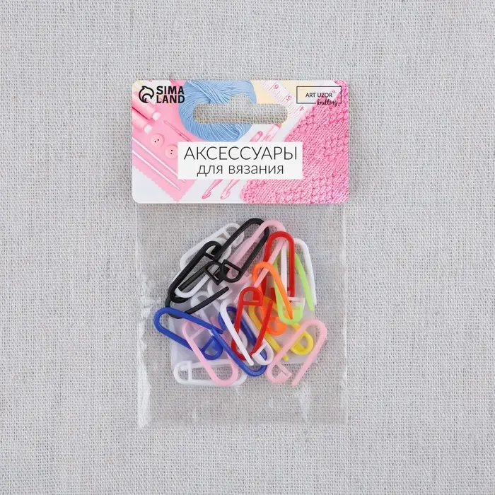 Длинный хвостик легко вдевается в петлю или столбик, затем фиксируется в замке, не деформирует и не растягивает вязку. Разными цветами удобно помечать участки в одном изделии: выделить спинку, пройму, полочку. Если допущена ошибка, можно за пару секунд снять и переставить булавку на другое место.