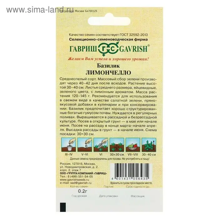 Среднеспелый сорт. Массовый сбор зелени производят через 40-42 дня после всходов. Растение высотой 30-40 см. Листья среднего размера, яйцевидные, зеленого цвета, с лимонным ароматом. Масса растения 120-145 г. Рекомендуется для использования в свежем виде в качестве салатной зелени, пряно-вкусовой добавки в кулинарии и при консервировании. Базилик предпочитает хорошо структурированные, богатые гумусом почвы. Нуждается в регулярных поливах. Выращивается в рассадной и безрассадной культуре. Посев в открытый грунт — в мае или начале июня. Посев на рассаду в конце марта — начале апреля. Высадка рассады в грунт - в начале июня. Схема посадки: 30х30 см.