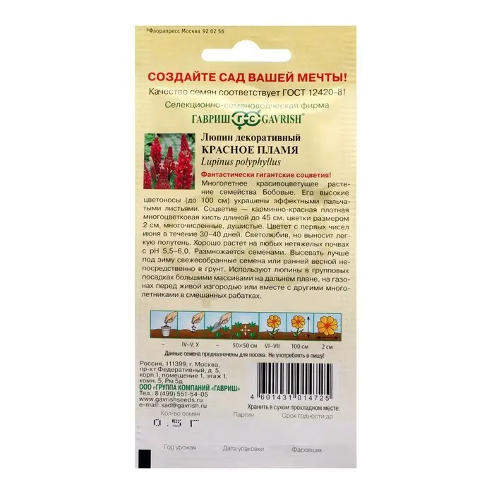 Семена цветов Люпин "Красное пламя", ц/п, 0,5 г