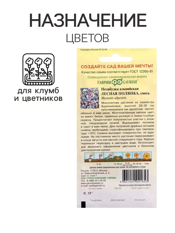 Многолетнее растение из семейства Бурачниковые высотой 20-30 см, культивируемое как двулетник. Цветет обильно в мае-июне. Многочисленные мелкие цветки имеют белую, карминно-розовую и темно-голубую окраску. Предпочитает полутенистые участки с влажной, плодородной почвой. Выращивают посевом в грунт мае-июне. На постоянное место растения пересаживают в конце августа или весной следующего года. Хорошо переносит пересадку в цветущем виде. Используют для весеннего оформления цветников и балконов, для получения срезки.