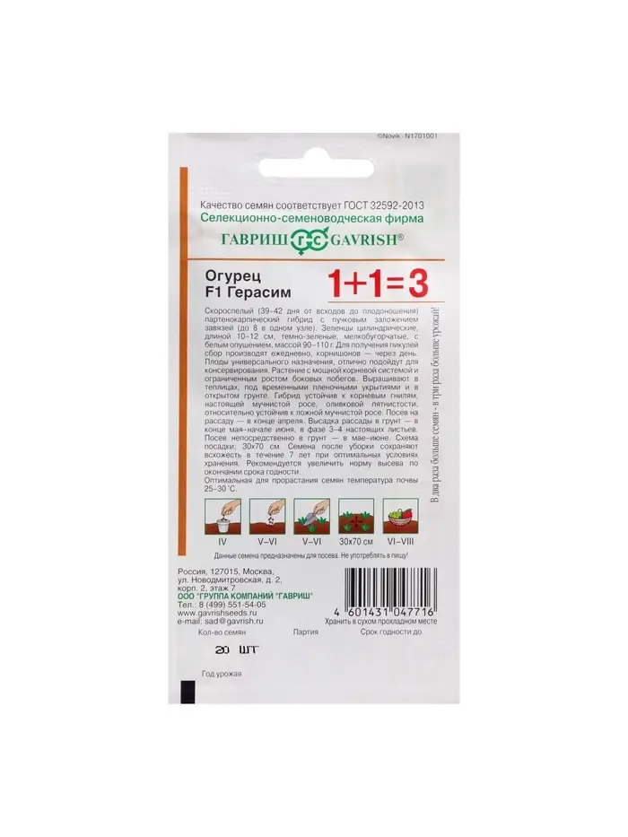 Семена Огурец "Лилипут", F1, пикуль, серия 1+1, 20 шт