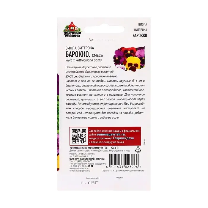 Семена цветов Виола "Барокко", ц/п, Виттрока, смесь, 0,05 г