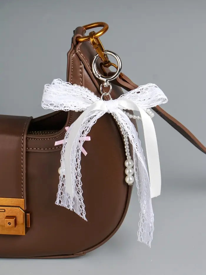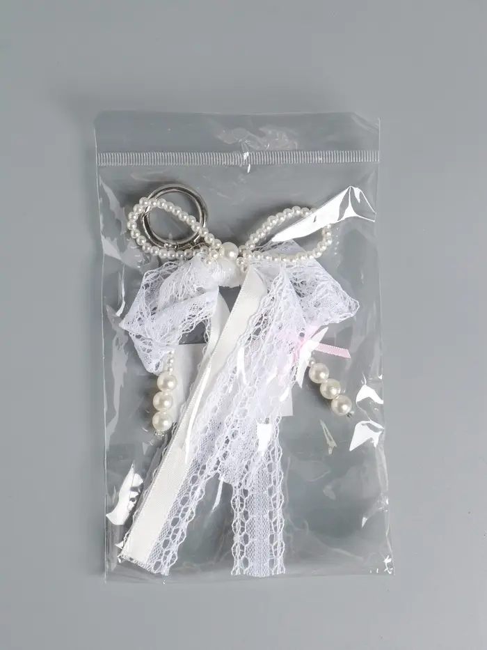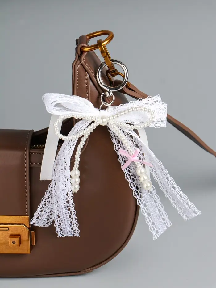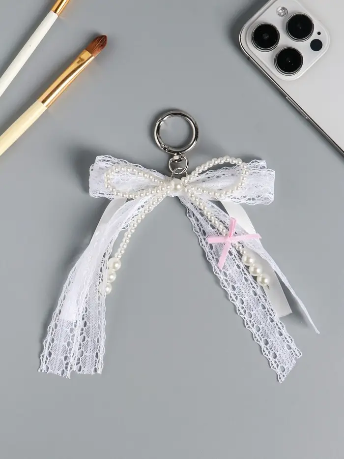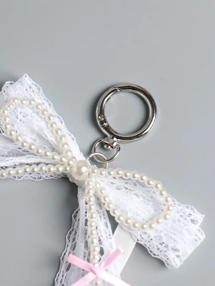 Брелок на карабине "Жемчужный бант с кружевной тесьмой" бусины d=0,4 и 0,8 см 16х9,5х1 см