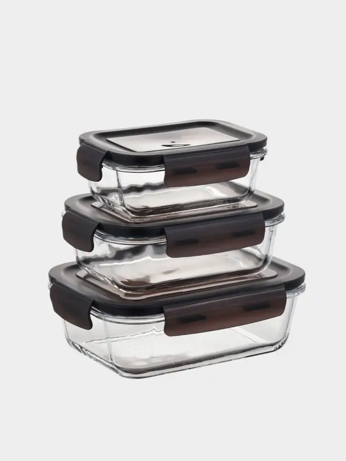 Набор стеклянных контейнеров с крышкой 3 шт, 410/690/1040 мл, черная крышка