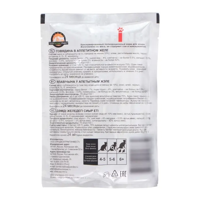 Сырой белок – 7%, сырой жир – 4%, сырая зола не более – 2%, сырая клетчатка не более – 0,5%, кальций – 0,5%, фосфор – 0,4%, массовая доля влаги не более – 82%