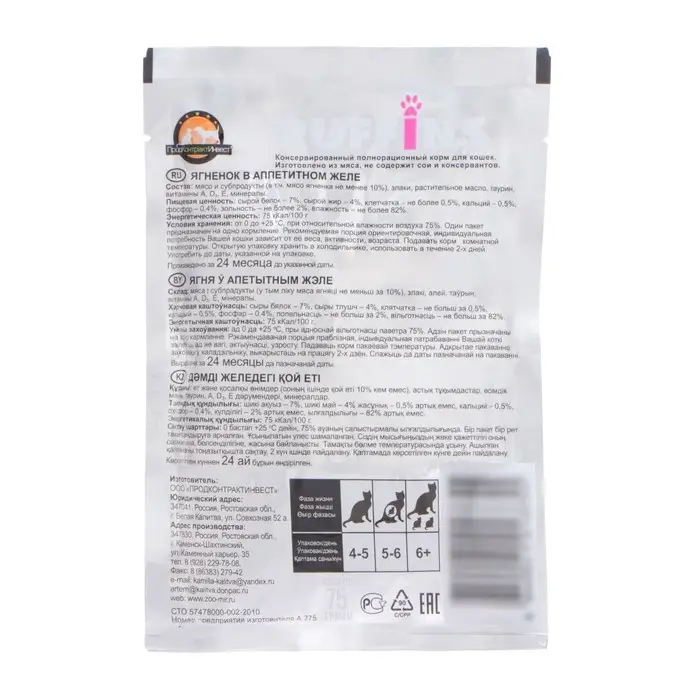 Состав: мясо и субпродукты (в том числе мясо ягненка не менее 10%), злаки, растительное масло, таурин, витамины А, D3, Е, минералы.