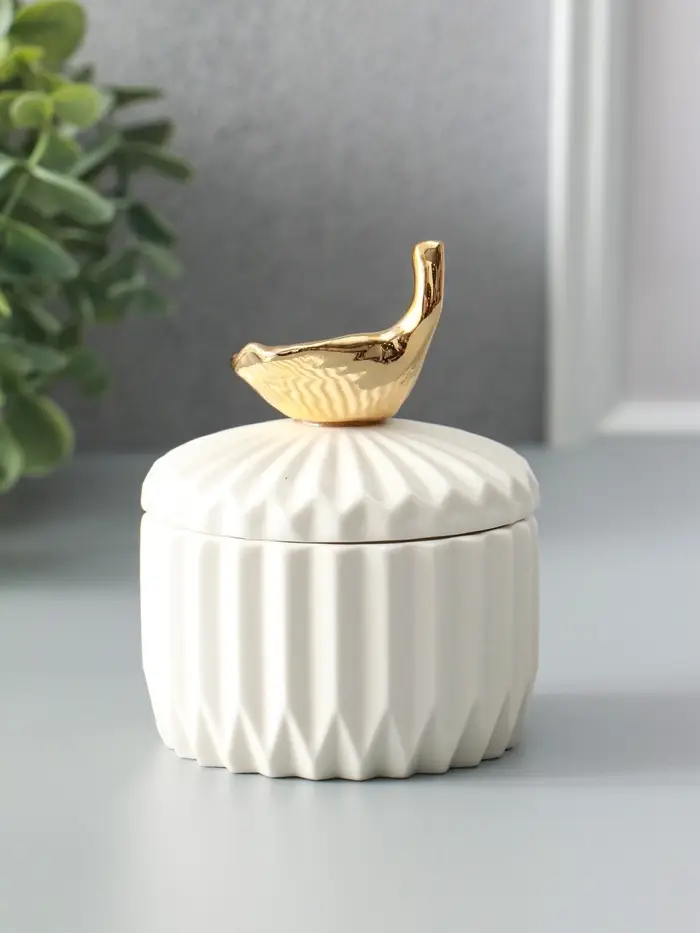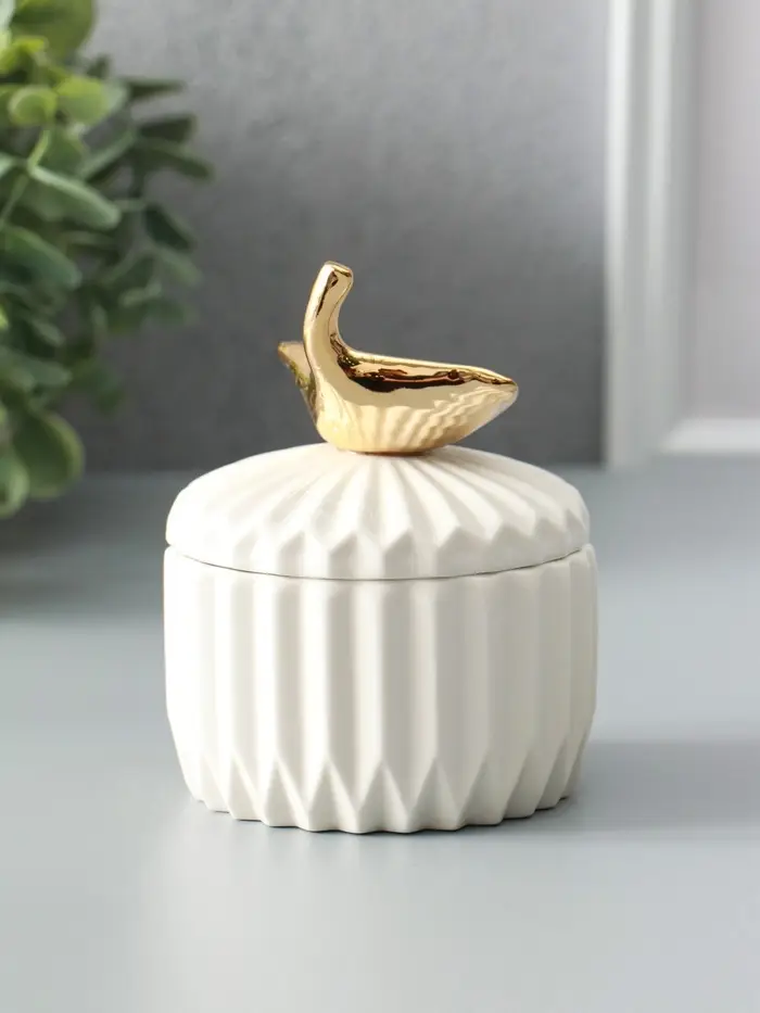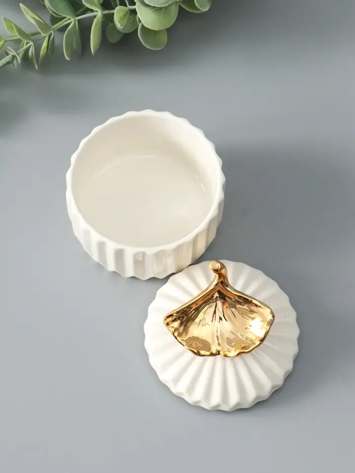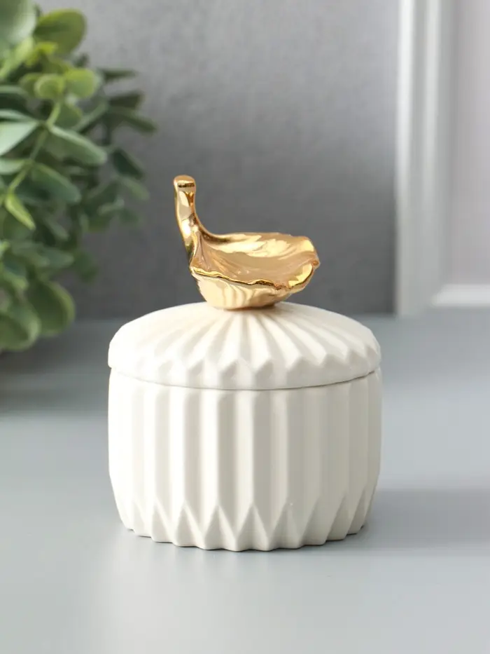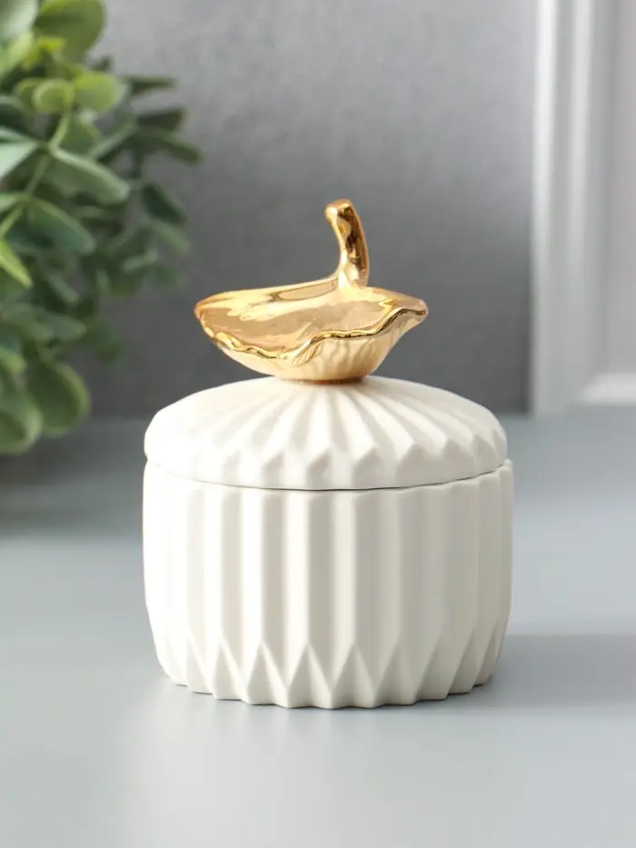 Шкатулка керамика "Золотой лист Гинкго" белая 8х8х10 см