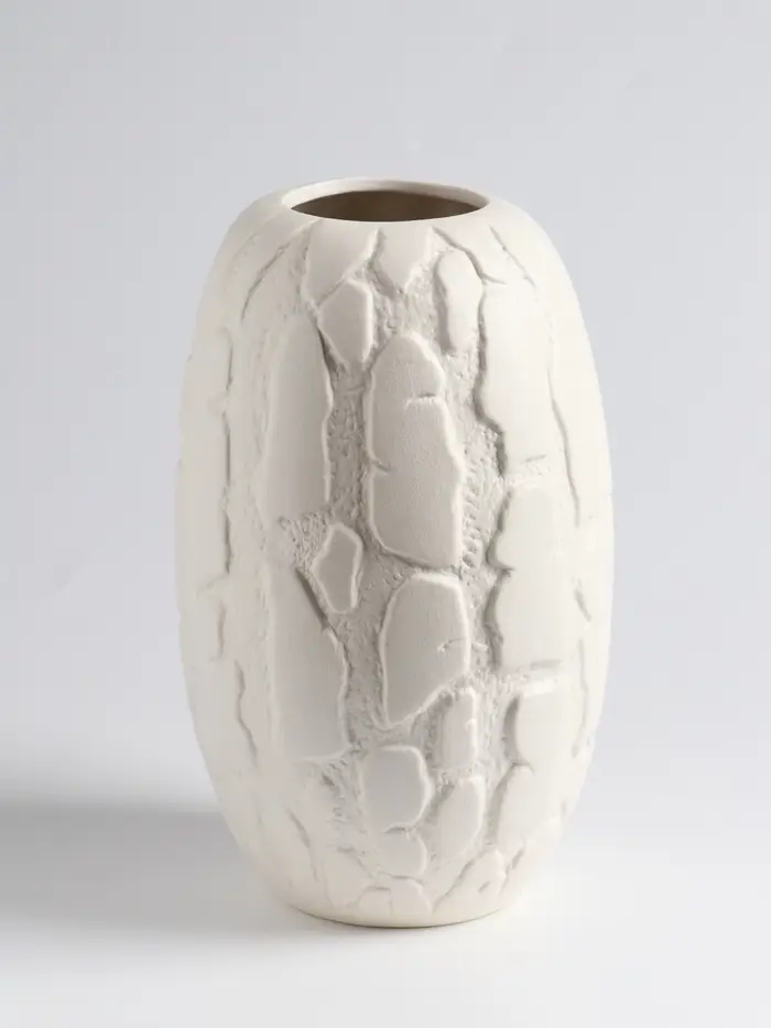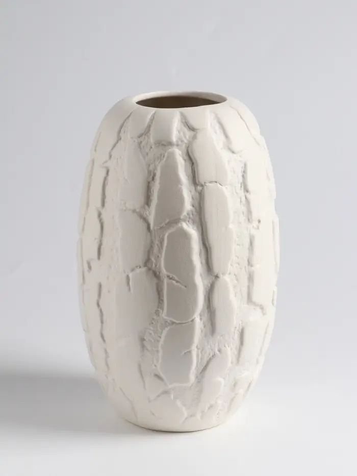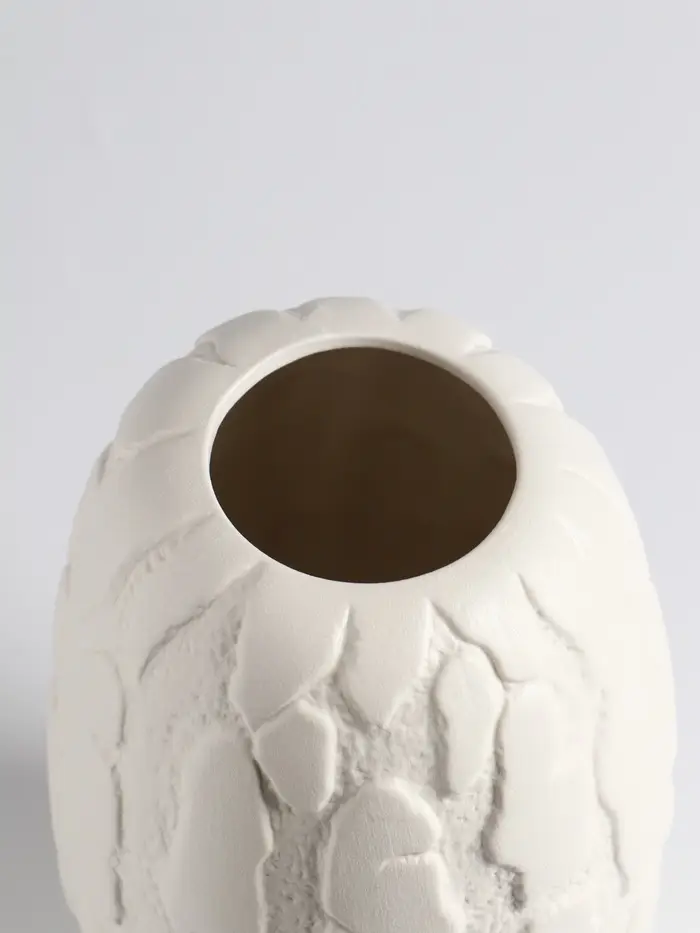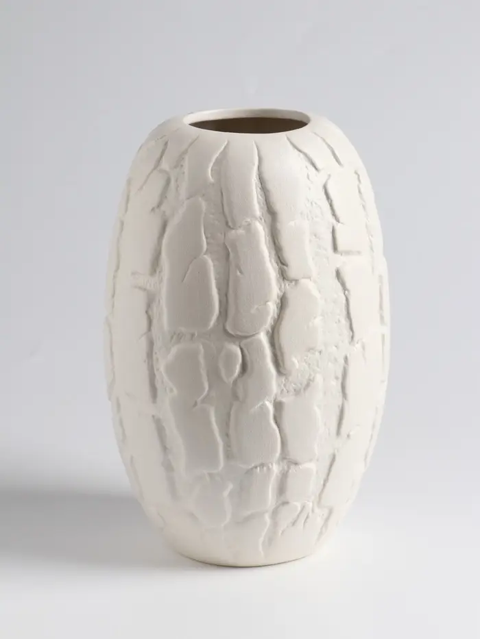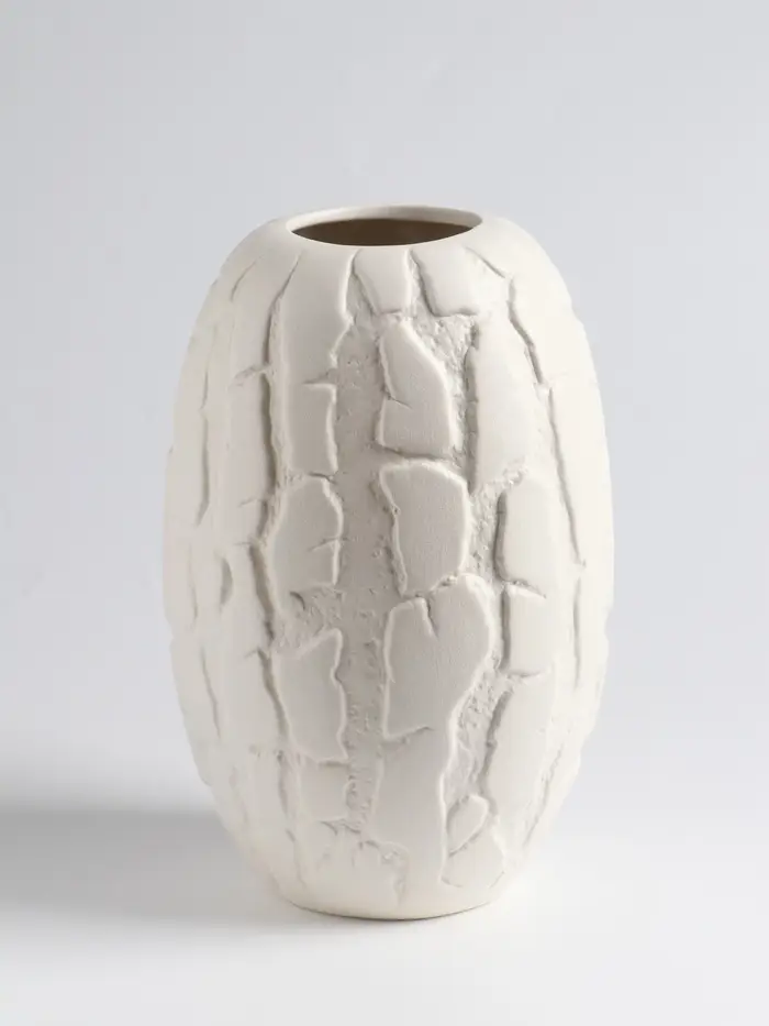 - Чистый белый цвет и фактура: Рельефная матовая поверхность керамики красиво рассеивает свет, добавляя в обстановку мягкость и объём. Ваза органично вписывается в скандинавский стиль, минимализм или классический интерьер.