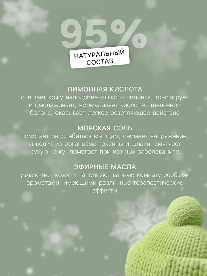 - Морская соль помогает расслабиться мышцам, снимает напряжение, выводит из организма токсины и шлаки, смягчает сухую кожу, помогает при кожных заболеваниях.