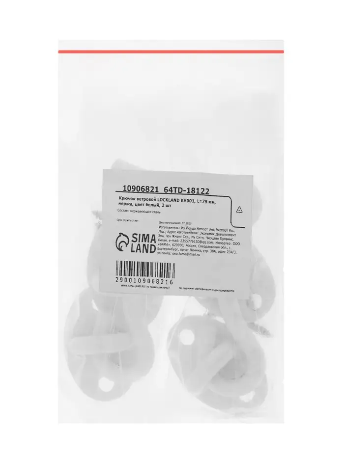 Крючок ветровой LOCKLAND KV001, L=75 мм, нержа, цвет белый, 2 шт