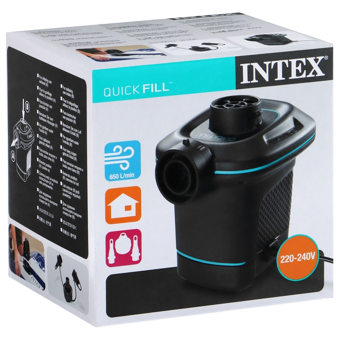 Электрический насос Intex 66640 работает от электрической сети 220В. С помощью данного насоса можно накачивать или сдувать любые надувные изделия производства Intex. В комплекте 3 насадки.