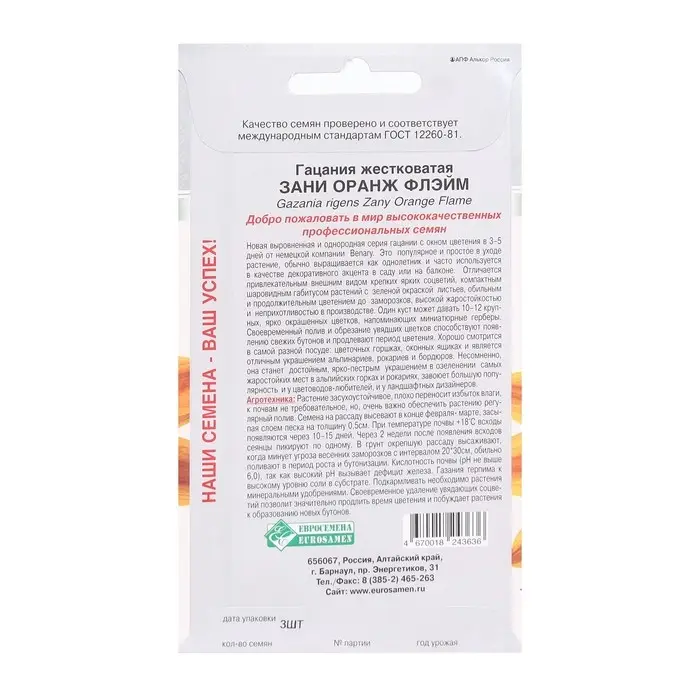 Семена Цветов Гацания жестковатая Зани Оранж Флэйм, 3 шт