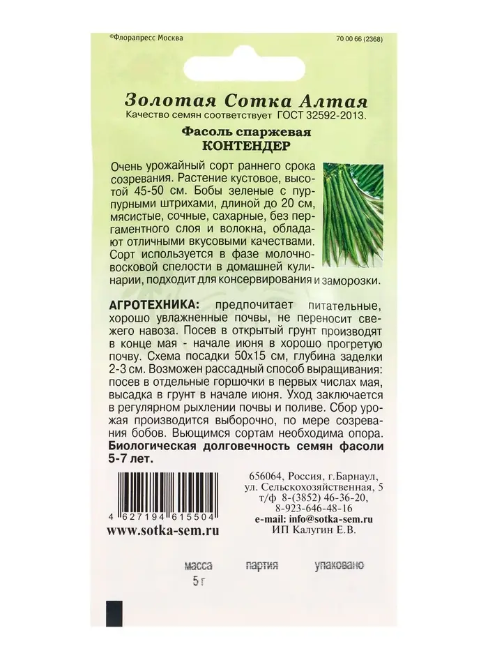 Семена Фасоль Контендер /Сотка/ 5г/ спарж. ранняя куст. 20см зеленые /*400