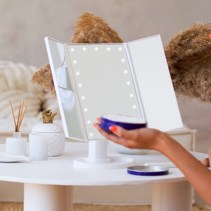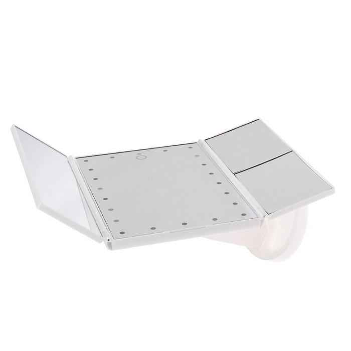 Это не просто зеркало, это 4 зеркала, предназначенных для идеального макияжа: фронтальное зеркало с подсветкой, зеркало бокового вида, зеркало с увеличением в 2 раза, зеркало с увеличением в 3 раза.