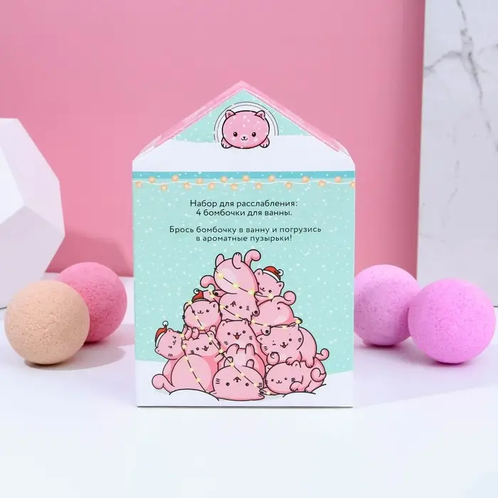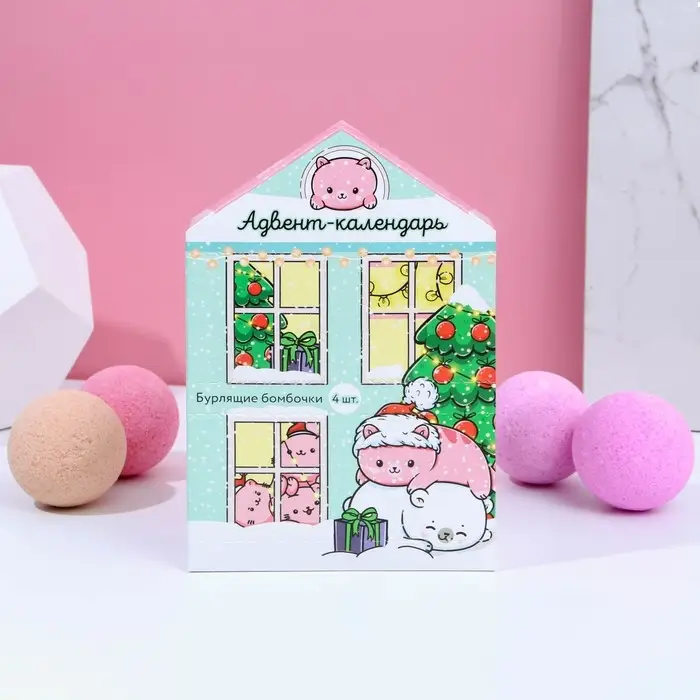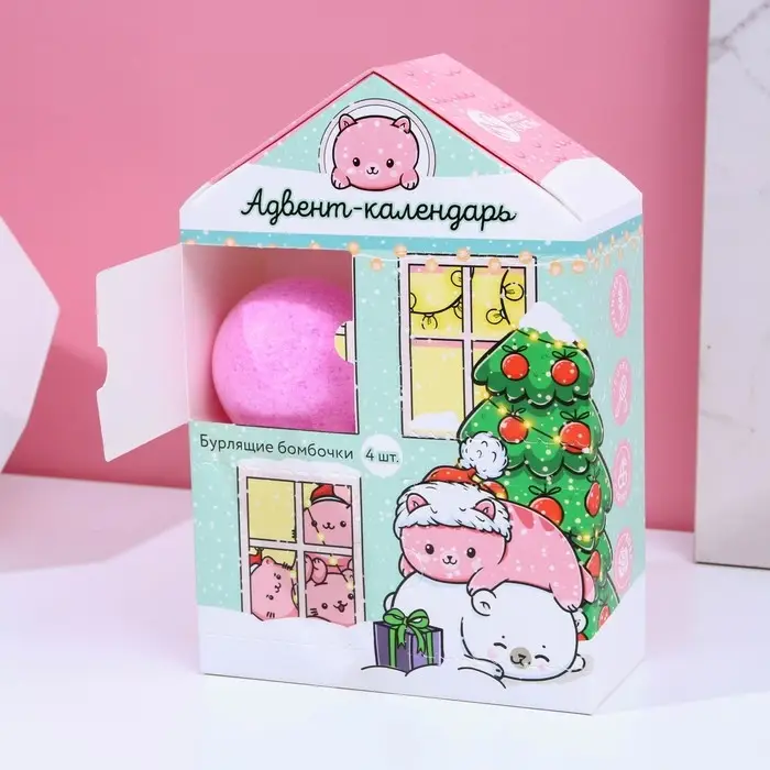 Адвент-календарь "С Новокотием!": бомбочки для ванны 4 шт по 130 г, ароматы лаванда, мёд, вишня, роза