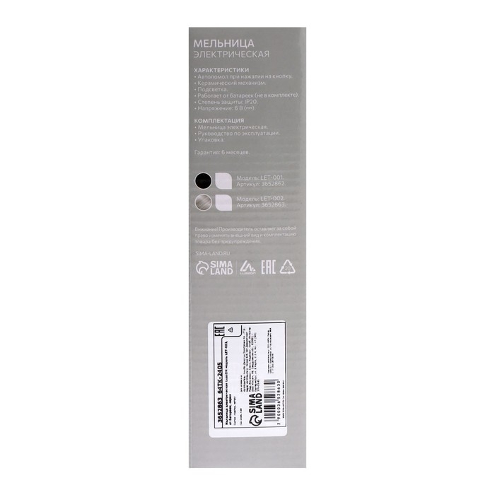 Мельница электрическая Luazon LET-002, металл, от батареек, серебристая
